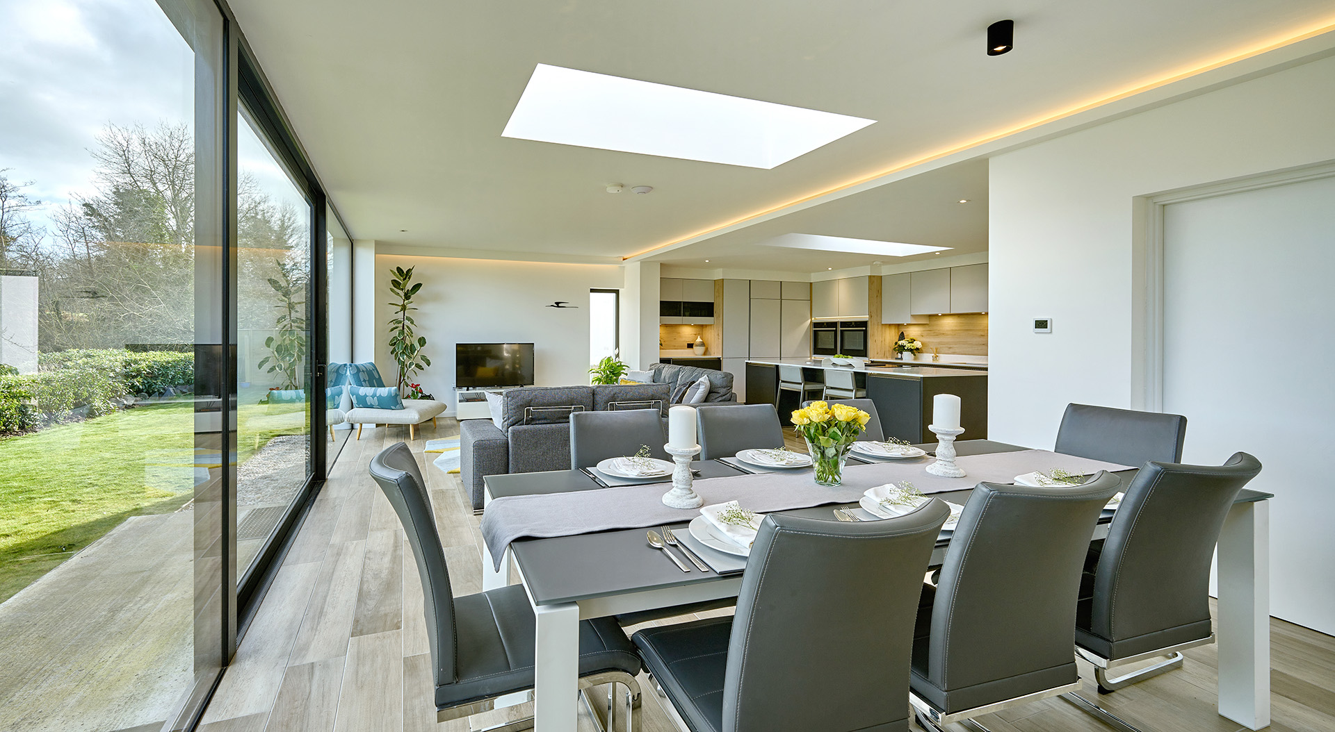 From concept to completion, this project was a complete rebuild designed to create a bright, spacious, and welcoming open-plan living area. The large floor-to-ceiling window feature wall floods the space with natural light, enhancing the warm tones of the natural wood finishes and the subtle, light-coloured cabinetry.