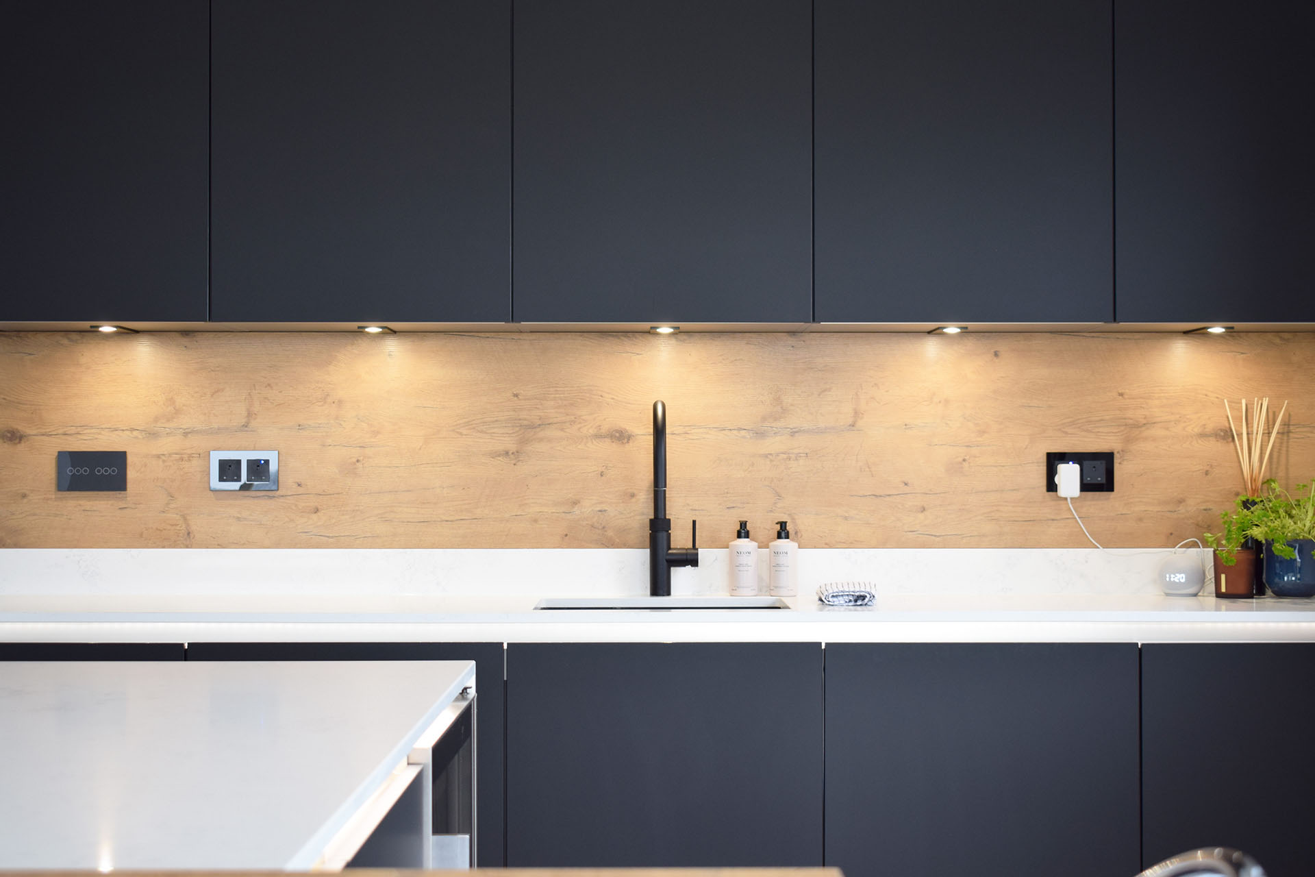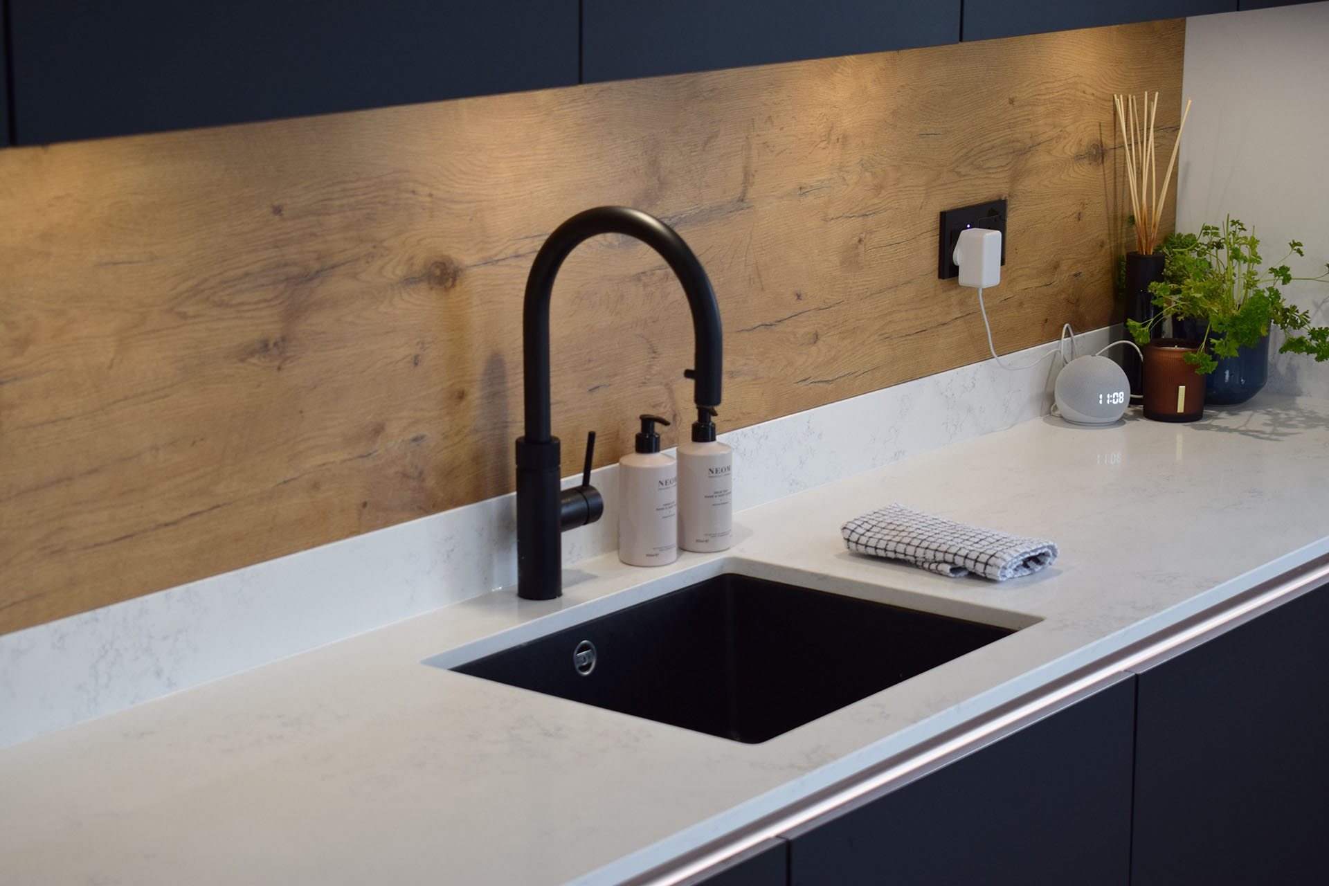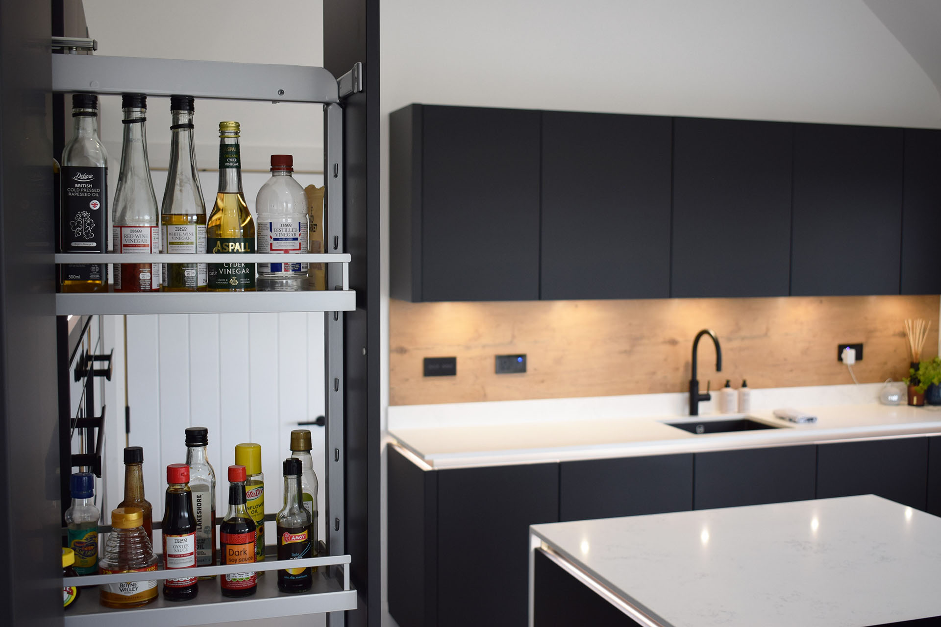 Every element of this kitchen was carefully planned to make daily living effortless. Deep drawers, internal storage, a dedicated cleaning cupboard, and a pull-out larder ensure everything has its place — perfect for maintaining a clutter-free space.