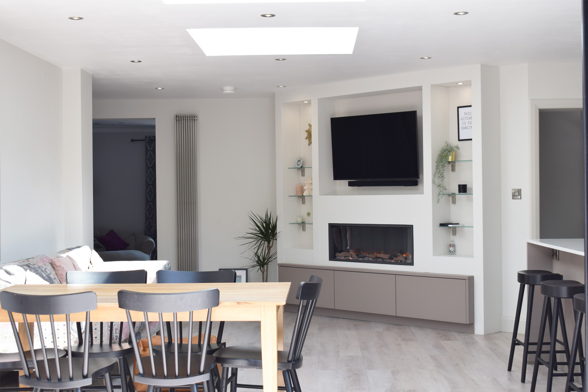 One of our favourite features is the peninsula, which creates a natural social hub for cooking, chatting, and spending time together. We also made the most of the sloping wall leading into the kitchen by incorporating a bespoke media wall, maximising every bit of space.